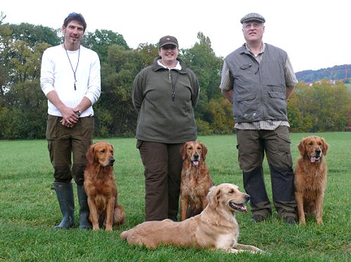Jürgen mit Fay, Petra mit Luzy, Gerhard mit Fellow, Nicole mit Jack und Sandra mit Anny bestehen die Jugendprüfung für Retriever mit sehr schönen Ergebnissen.